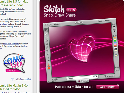 Categories Freebies Multimedia Skitch: Snap Draw Share Post author By ArtWave Post date May 23, 2009 The Internet Camera. Snap, Draw, Share! A Mac Screenshot application and it’s Free. Tags applications, creative multi media, mac, screenshot